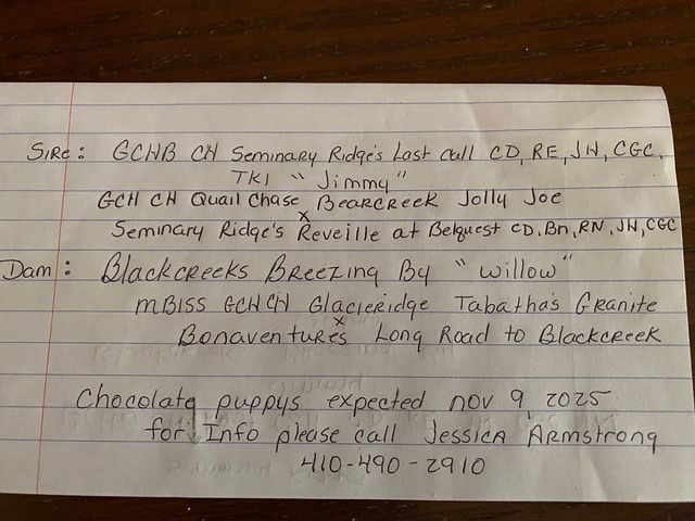 Jessica Armstrong's puppies were born on November 7. (5 boys and 5 girls) born Friday Nov.7 2025. For information, call 410-490-2910.